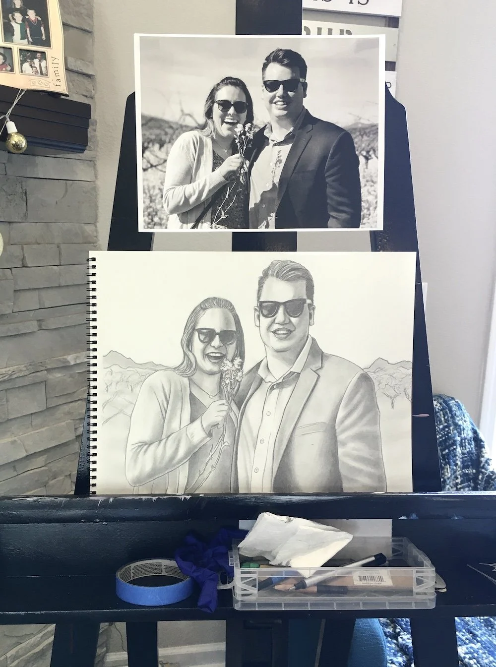 This piece was a complete surprise for the bride-to-be! The bride’s mother wanted to give her daughter a special gift - live art for her bridal shower. I was given a sentimental photo of the couple, taken during their trip to Napa Valley in California where the groom proposed. I created this pencil sketch from beginning to end and got to chit-chat with the guests during the process.